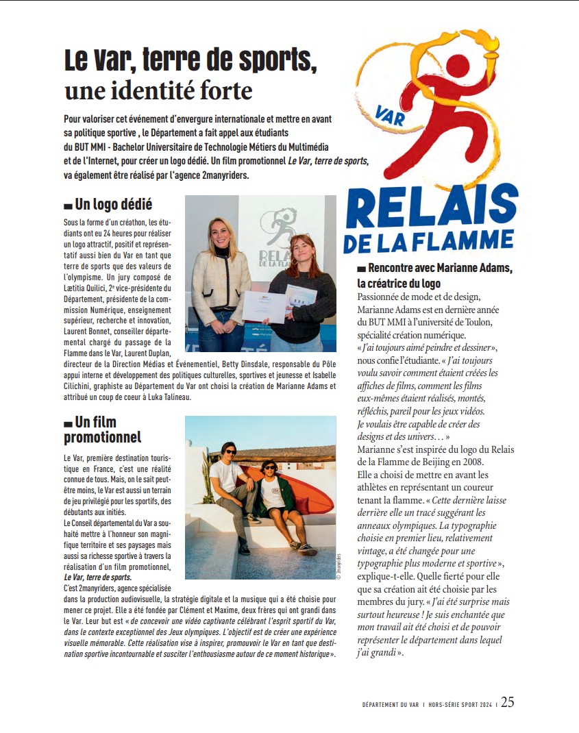 Dans le cadre de ma formation MMI, j’ai eu la chance de participer à un concours organisée par le département du Var. Nous devions créer  le logo du passage de la flamme Olympique dans le Var. J’ai remporté le prix du Jury et ainsi la première place.