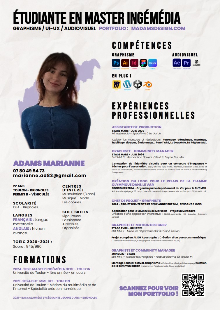 Dans le cadre de ma formation MMI, j’ai été cheffe de projet pour l’application fictive Map’Ollon. J’ai pu apprendre comment gérer une équipe et un projet. Ci-dessous, vous pourrez visualiser les différents stage que j’ai  pu réalisé durant mon parcours universitaire.